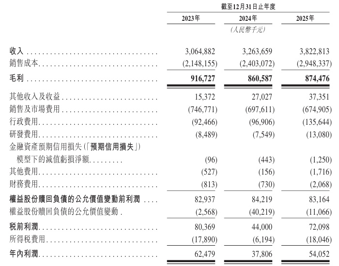 业绩方面,2023年、2024年、2025年,该公司收入分别约为30.65亿元、32.64亿元、38.23亿元人民币;同期,年内利润分别为6247.9万元、3780.6万元、5405.2万元人民币。