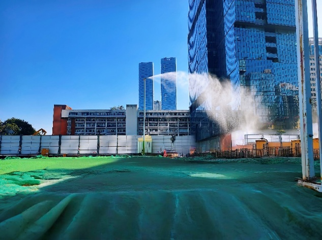 记者了解到,该项目气膜采用高强度PVDF膜材搭配全封闭结构,如同给基坑盖上一层“隔音防尘被”,实测降噪20%,膜外基本无明显施工噪音;全封闭结构可物理阻断粉尘外溢,搭配内部高杆雾桩、线性喷淋、雾炮机立体降尘系统,PM10浓度稳定维持在低位,实现扬尘零外溢;同时采用全回转全护筒工艺,进一步降低施工振动,将对地铁线路扰动降至最低,真正做到“施工不扰行、建设不扰民”。