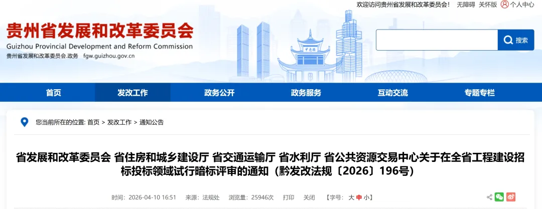 近日,贵州省发改委、住建厅、交通运输厅、水利厅、公共资源交易中心等五部门联合印发《关于在全省工程建设招标投标领域试行暗标评审的通知》(黔发改法规〔2026〕196号),自2026年6月1日起试行,试行期三年。通知明确在全省依法必须招标的房屋建筑、市政基础设施、水利、交通等工程领域的施工、勘察、设计和监理项目试行暗标评审。