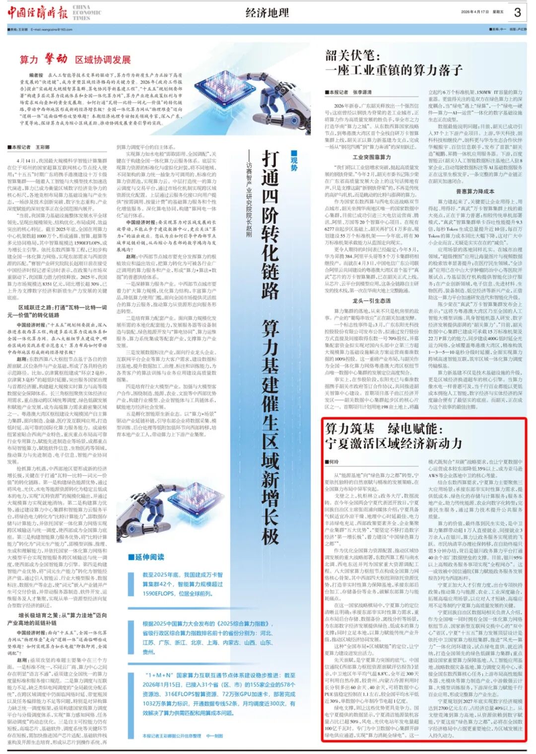 在人工智能等技术变革的驱动下,算力作为新质生产力正按下高质量发展的“快进键”,成为重塑区域经济格局的关键力量。2026年《政府工作报告》提出“实施超大规模智算集群、算电协同等新基建工程”。“十五五”规划纲要部署“构建多层次算力设施体系和全国一体化算力网”,算力产业迎来政策红利与市场需求双向叠加的黄金发展期。如何打通“瓦特—比特—词元—价值”的转化链路,带动中西部地区形成新的经济增长极?全国一体化算力网从“物理堆叠”迈向“逻辑一体”还面临哪些攻坚难题?本期经济地理专访相关领域专家,深入广东、宁夏等地,探访算力成为缩小区域差距、推动协调发展重要引擎的实践。