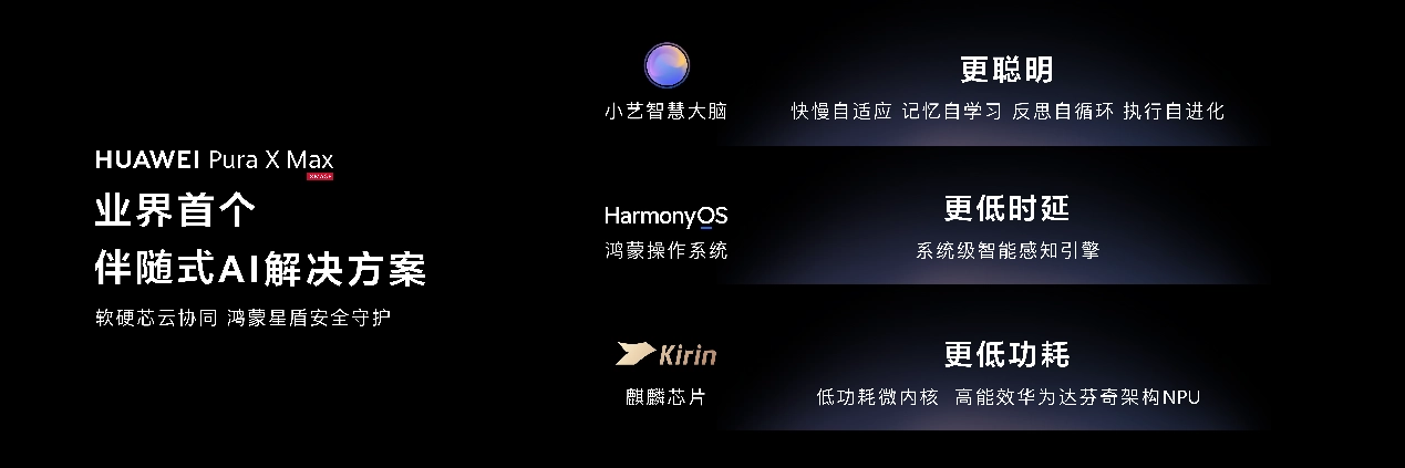 全新小艺智慧大脑,搭载 Agentic 自演进架构具备像人脑一样的记忆、反思、进化能力。华为 Pura X Max 搭载的小艺伴随式 AI,作为业界首创的伴随式 AI 解决方案,依托小艺智慧大脑能力深度融合鸿蒙操作系统和强大麒麟 9030 Pro 芯片,软硬芯云协同实现更低功耗、更低时延、更聪明的使用体验,配合鸿蒙星盾安全架构,筑牢安全防线。与此同时,小艺伴随式 AI 联合滴滴出行、咪咕视频、知乎等众多生态伙伴带来全新伴随式 AI 体验,并将与更多伙伴持续联合创新,开启伴随式 AI 新时代。
